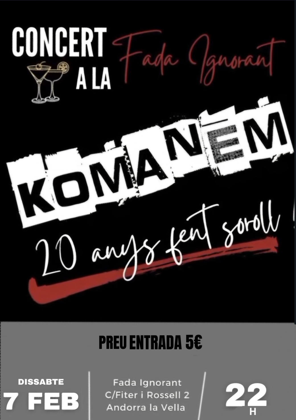 KOMANEM grup d’Andorra de rock català tornen a la Fada per celebrar els 20 anys de la seva existència el dissabte 7 de febrer a les 22h Entrada: 5€ ja la podeu comprar a la Fada Ignorant. Aforament Limitat