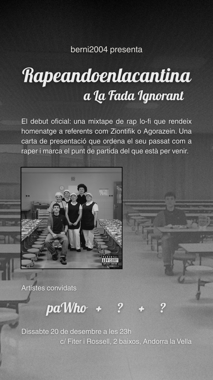 Berni jove talent d’Andorra ens presenta el seu primer EP Rapeandoenlacantina per primer cop a La Fada Ignorant. Entrada Lliure.